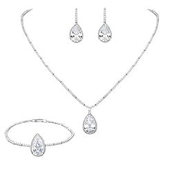 EVER FAITH Silver-Tone CZ Floral Leaves Water Drop Necklace Earrings Bracelet Set