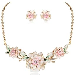 EVER FAITH Women’s Austrian Crystal Enamel 3 Peony Flowers Necklace Earrings Set Gold-Tone