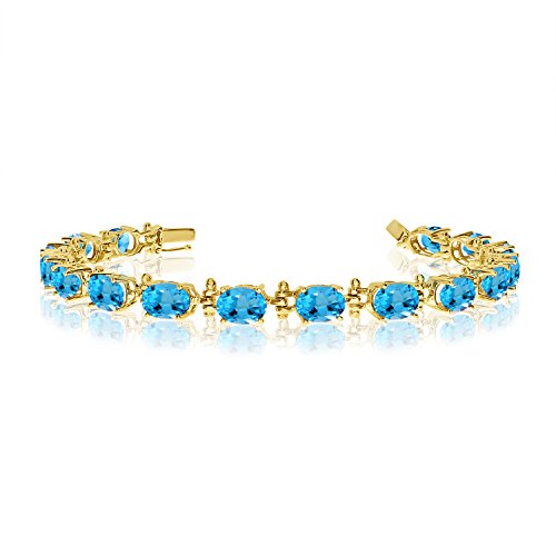 This 14k yellow gold blue topaz bracelet features 16 7×5 oval stunning natural blue topaz stones with 16.00 ct total gem weight.