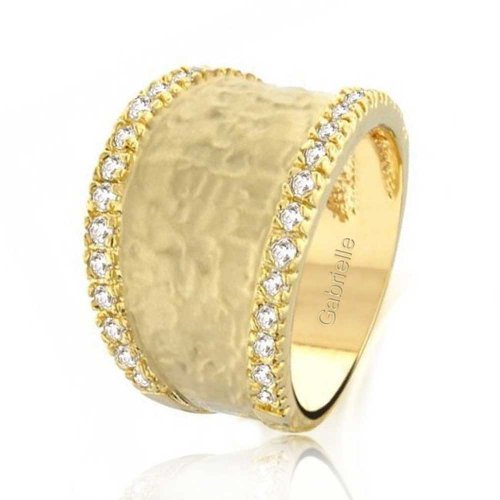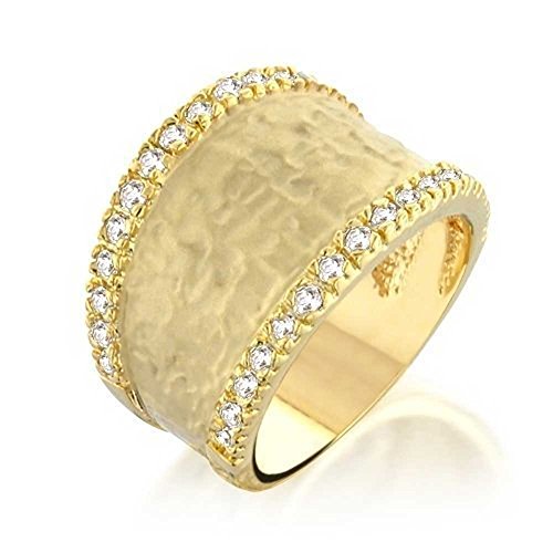 CAPTIVATING AND UNIQUE – This size 6 hammer textured ring has pave CZ borders and a wide band. Gold plated and modern, this matter ring makes a great gift and a wonderful accessory.