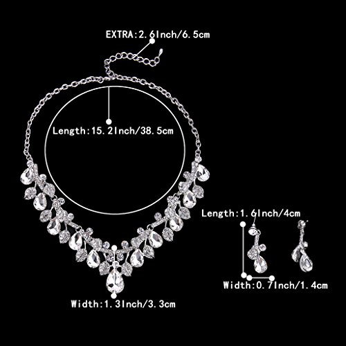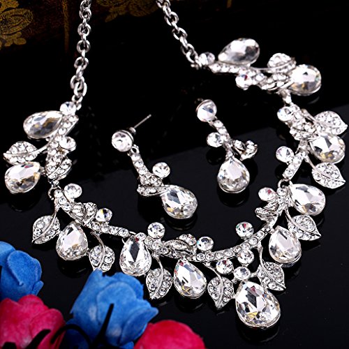 BriLove Wedding Bridal Necklace Earrings Jewelry Set for Women Crystal Enamel Teardrop Cluster Leaf Vine Statement Necklace Dangle Earrings Set Clear Silver-Tone