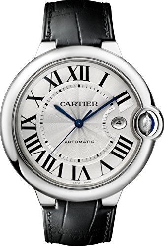 Stainless steel case with a black alligator leather strap. Fixed stainless steel bezel. Silvered opaline dial with blue sword-shaped hands and Roman numeral hour markers. Minute markers around an inner ring. Dial Type: Analog. Date display appears at the 3 o’clock position. Automatic movement with a 42-hour power reserve. Scratch resistant sapphire crystal. Fluted crown set with a blue spinel cabochon. Solid case back. Case diameter: 42.1 mm. Case thickness: 13 mm. Round case shape. Band width: 18.8 mm. Band length: 7 inches. Deployment clasp. Water resistant at 30 meters / 100 feet. Functions: date, hour, minute, second. Luxury watch style. Watch label: Swiss Made. Cartier Ballon Bleu Automatic Silver Dial Stainless Steel Black Leather Men’s Watch W69016Z4.