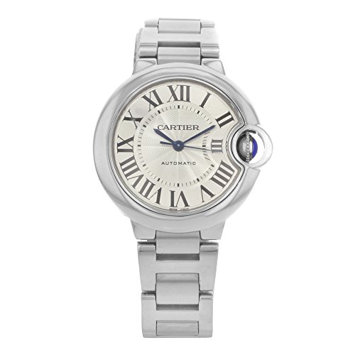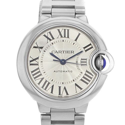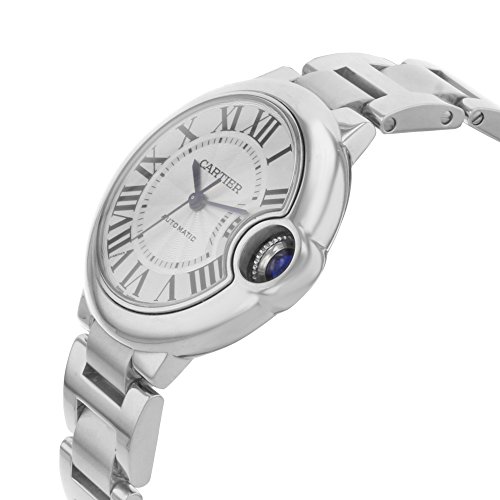 Stainless steel case with a stainless steel bracelet. Fixed stainless steel bezel. Silver flinque dial with blue hands and Roman numeral hour markers. Minute markers around an inner ring. Dial Type: Analog. Automatic movement with a 38-hour power reserve. Scratch resistant sapphire crystal. Fluted crown set with synthetic spinel cabochon. Solid case back. Case diameter: 33 mm. Case thickness: 9.96 mm. Round case shape. Deployment clasp with push button release. Water resistant at 30 meters / 100 feet. Functions: hour, minute, second. Luxury watch style. Watch label: Swiss Made. Cartier Ballon Bleu Automatic Silver Flinque Dial Stainless Steel 33 mm Ladies Watch W6920071.