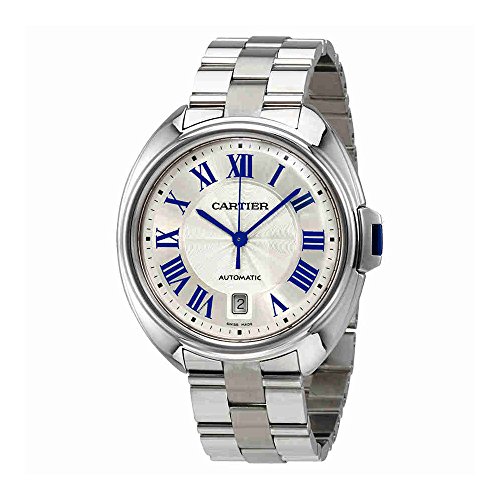 Stainless steel case with a stainless steel bracelet. Fixed stainless steel bezel. Silver dial with blue hands and Roman numeral hour markers. Minute markers around the outer rim. Dial Type: Analog. Date display at the 6 o’clock position. Caliber 1847MC automatic movement with a 48-hour power reserve. Scratch resistant sapphire crystal. Transparent case back. Case size: 40 mm. Case thickness: 11.76 mm. Round case shape. Fold over clasp. Water resistant at 30 meters / 100 feet. Functions: date, hour, minute, second. Luxury watch style. Watch label: Swiss Made. Cartier Cle Automatic Silver Dial Men’s Watch WSCL0007.