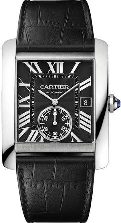 Silver-tone stainless steel case with a black alligator leather strap. Fixed silver-tone stainless steel bezel. Black opaline dial with silver-tone hands and Roman numeral hour markers. Minute markers around an inner ring. Dial Type: Analog. Date display at the 3 o’clock position. Seconds sub-dial at the 6 o’clock position subdials. Cartier Calibre 1904-PS MC automatic movement with a 48-hour power reserve. Scratch resistant sapphire crystal. Octagon-shaped set with a synthetic blue spinel crown. Skeleton case back. Rectangle case shape, case size: 44 mm x 34.3 mm, case thickness: 9.5 mm. Deployment clasp. Water resistant at 30 meters / 100 feet. Functions: date, hour, minute, small second. Luxury watch style. Watch label: Swiss Made. Cartier Tank MC Automatic Black Dial Black Leather Men’s Watch W5330004.