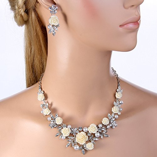 EVER FAITH Women’s Austrian Crystal Simulated Pearl Rose Flower Leaf Necklace Earrings Set