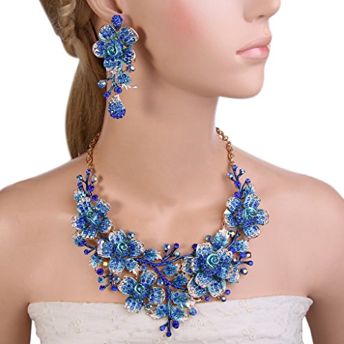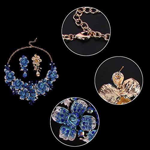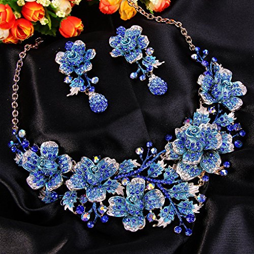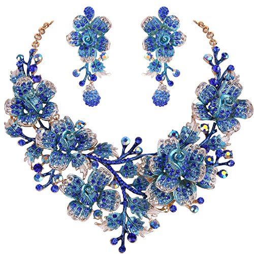EVER FAITH Women’s Crystal Elegant Flower Leaf Bridal Necklace Earrings Set Dark Blue Gold-Tone