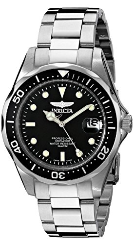 Big, bold and masculine, the Invicta Quartz Pro Diver 8932 is an affordable luxury watch with classically styled features. This precisely constructed quartz timepiece for men features a solid stainless steel case that’s 37.5mm wide, slightly smaller than its 8926 cousin. It has a black face with Tritnite luminous hands and markers and a unidirectional black bezel with white numerals and markings. Other features include anti-reflective mineral crystal, date display at 3 o’clock, and water resistance to 200 meters. The highly polished stainless steel band has a diver buckle with safety clasp.