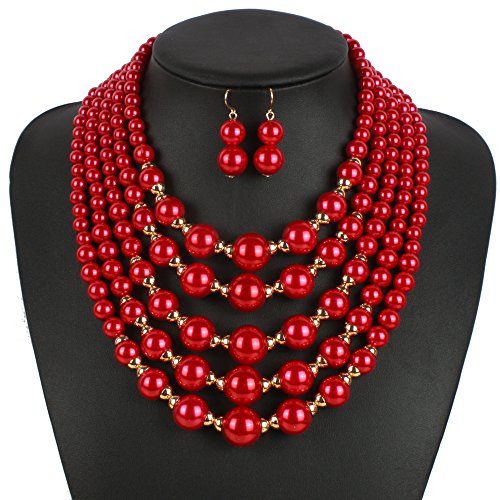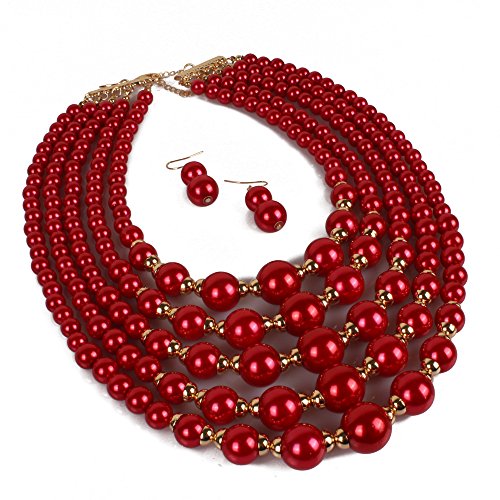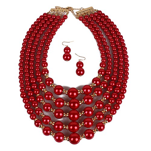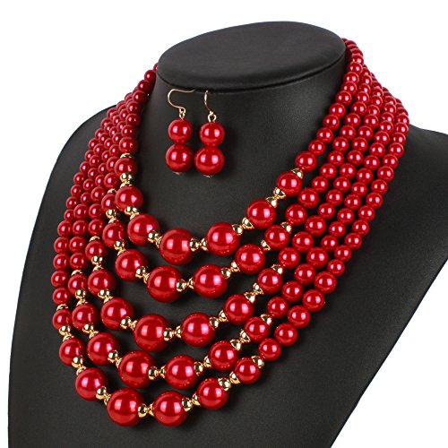 KOSMOS-LI Women’s Simulated Faux Five Multi-Strand Red Pearl Statement Necklace and Earrings Set
