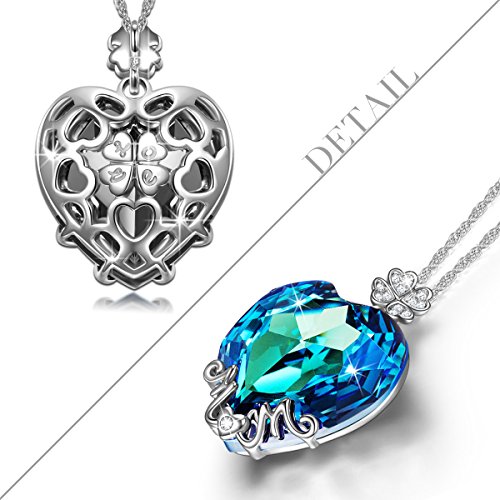 LADY COLOUR Valentines Gifts for Her, Best Mom Gifts, Blue Heart MOM Pendant Necklace Made with Swarovski Crystals, Lucky Clover Design Hypoallergenic Jewelry Gift Box Packing