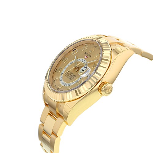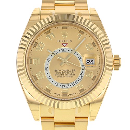 Rolex Sky-Dweller 18k Yellow Gold w/ Champagne Dial Ref: 326938. The Dial is 42mm 18k Yellow Gold w/ Champagne Dial w/ Arabic Numerals, Fluted Bezel & Scratch-resistant Sapphire, Cyclops lens over the Date. The Movement is Perpetual, mechanical , self-winding, dual time zones, annual Calendar w/ 9001 Calibre, 40 jewels & 72 hours power reserve. The Bracelet is Oyster 18k Yellow Gold with Folding Oysterclasp with Easylink 5mm comfort extension link. The Watch comes with Aftermarket Watch-box & 2 Year Store Warranty.
