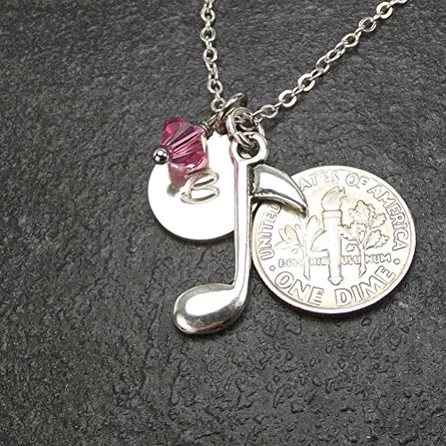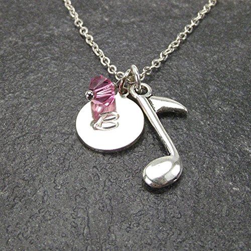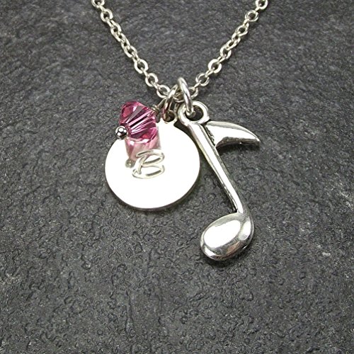 Adorable music note necklace is comprised of a 1/2″ round letter disk your choice of letter and a hand wrapped Swarovski Elements birthstone crystal, strung on a silver plated brass necklace