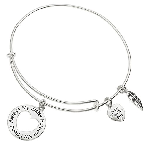 Qina C Sterling Silver Always My Sister Forever My Friend Love Heart Feather Dangle Charm Family Adjustable Wire Bangle Bracelet