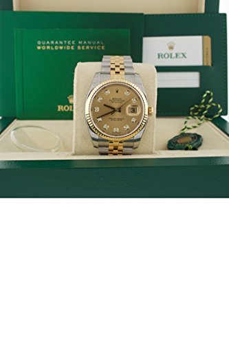 Stainless steel case with a 18kt yellow gold and stainless steel jubilee bracelet. Fixed, fluted bezel bezel. Champagne with 10 diamonds dial with gold tone hands and diamonds hour markers. Date display at the 3 o’clock position. 31 jewels automatic movement. Scratch resistant sapphire crystal. Case diameter: 36 mm. Hidden deployment clasp. Water resistant at 100 meters/ 330 feet. AdditionalInfo: date displays at 3 o’clock position. Rolex Datejust Silver Diamond Dial Jubilee Bracelet Fluted Bezel Two Tone Men’s Watch