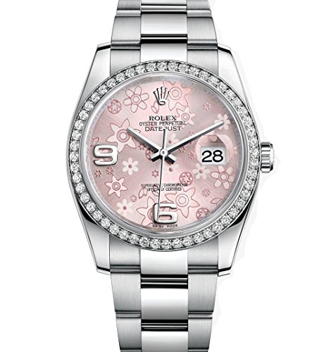 ROLEX DATEJUST 36MM STAINLESS STEEL WATCH WITH DIAMOND BEZEL PINK FLORAL DIAL