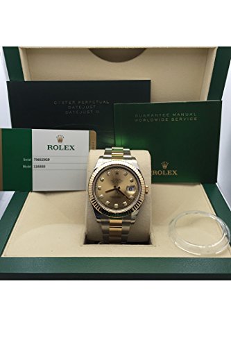 Stainless steel and 18kt yellow gold case with a stainless steel and 18kt yellow gold bracelet. Fluted bezel. Champagne dial with yellow-gold tone hands and diamond hour markers. Minute markers around the outer rim. Dial Type: Analog. Date display at the 3 o’clock position. Automatic movement. Scratch resistant sapphire crystal. Screw down crown. Solid case back. Case diameter: 41 mm. Oysterclasp clasp. Water resistant at 100 meters / 330 feet. Functions: hours, minutes, seconds, date. Casual watch style. Watch label: Swiss Made. Rolex Datejust II Champagne Dial Automatic Stainless Steel and 18kt Yellow Gold Men’s Watch