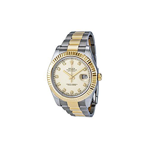 Stainless steel case with a stainless steel Rolex oyster bracelet with 18kt yellow gold center links. Fixed fluted 18kt yellow gold bezel. Ivory dial with yellow gold hands and diamond hour markers. Minute markers around the outer rim. Dial Type: Analog. Date display at the 3 o’clock position. Automatic movement with a 48-hour power reserve. Scratch resistant sapphire crystal. Screw down crown. Solid case back. Case size: 41 mm. Case thickness: 13 mm. Round case shape. Band width: 18 mm. Band length: 8 inches. Oysterlock clasp. Water resistant at 100 meters / 330 feet. Functions: date, hour, minute, second. Luxury watch style. Watch label: Swiss Made. Rolex Datejust II Automatic Ivory Dial Stainless steel and 18kt Yellow Gold Rolex Oyster Men’s Watch 116333IDO.