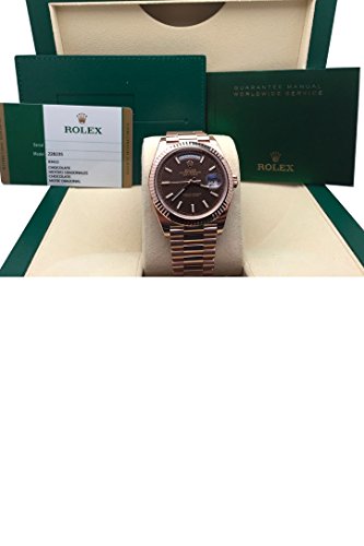 18k everose gold case with a 18k everose gold Rolex President bracelet. Fixed – fluted 18k everose gold bezel. Chocolate dial with rose-gold tone hands and index hour markers. Minute markers around the outer rim. Dial Type: Analog. Date display at 3 o’clock; day display at 12 o’clock.. Automatic movement. Scratch resistant sapphire crystal. Screw down crown. Solid case back. Case diameter: 40 mm. Round case shape. Concealed Crown clasp. Water resistant at 100 meters / 330 feet. Functions: date, day, hour, minute, second. Luxury watch style. Watch label: Swiss Made. Rolex Day-Date 40 Chocolate Dial 18K Everose Gold President Automatic Men’s Watch 228235.