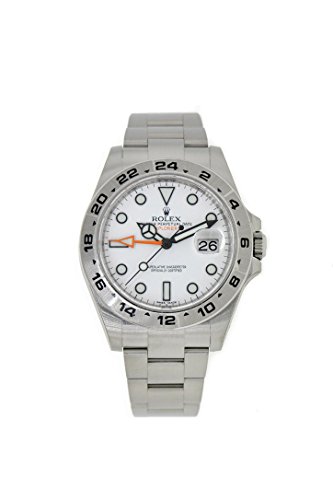 Stainless steel case with a stainless steel oyster bracelet. Fixed stainless steel bezel with 24 hour markings. White dial with silver-tone hands and dot hour markers. Minute markers around the outer rim. Dial Type: Analog. Luminescent hands and markers. Date display appears at the 3 o’clock position. Automatic movement. Scratch resistant sapphire crystal. Screw down crown. Solid case back. Case diameter: 42 mm. Case thickness: 13 mm. Round case shape. Band width: 15 mm. Band length: 7 inches. Oyster clasp. Water resistant at 100 meters / 330 feet. Functions: date, hour, minute, second. Casual watch style. Watch label: Swiss Made. Rolex Explorer II White Automatic Stainless Steel Men’s Watch 216570