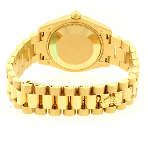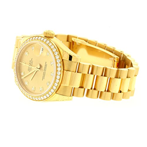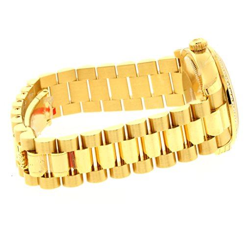 18k yellow gold case with a 18k yellow gold president bracelet. Fixed bezel set with 48 diamonds bezel. Champagne dial with gold-tone hands and diamonds hour markers. Dial Type: Analog. Date display at the 3 o’clock position. Automatic movement. Scratch resistant sapphire crystal. Screw down crown. Solid case back. Case diameter: 26 mm. Concealed crown clasp. Water resistant at 100 meters / 330 feet. Functions: date, hour, minute, second. Casual watch style. Watch label: Swiss Made.