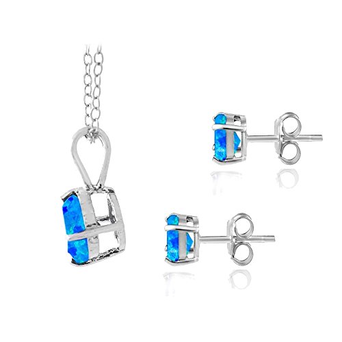 This classic jewelry set showcases a round solitaire pendant and matching stud earrings. The pendant showcases a sparkling 7mm synthetic white opal gemstone and dangles from a thin 18-inch rolo chain. The stud earrings feature two 5mm Synthetic white opal stones and is secured with post and friction backs. The jewelry set is crafted of sterling silver.